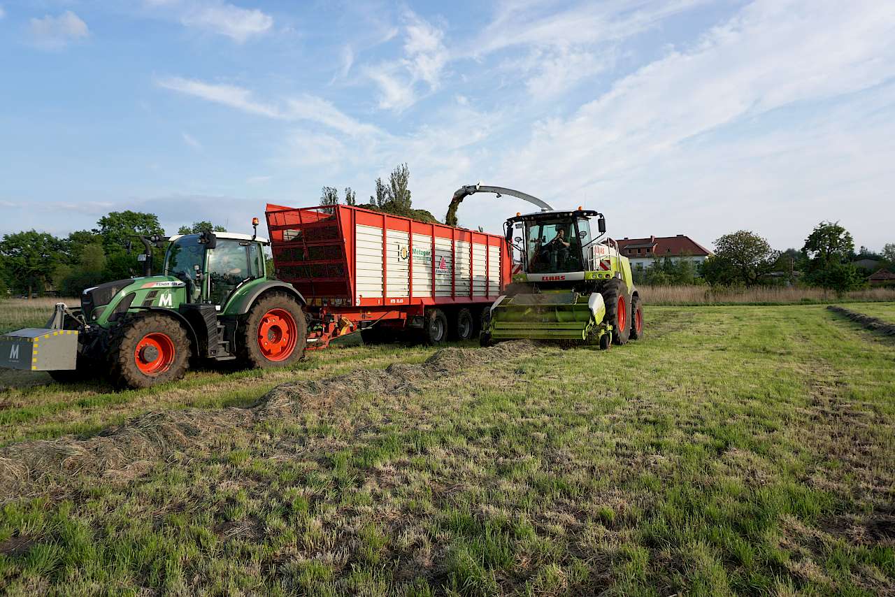Im Mai haben waren wir mit unseren zwei Maislegemaschinen unterwegs, um für unsere Kunden ca. 700 ha Mais zu legen. Außerdem haben wir noch ein wenig Gülle gefahren. Die Grasernte lief auch langsam an: Beide Mähkombinationen, zwei Schwader, mehrere Transportfahrzeuge und unsere sechs Claas Häcksler waren im Einsatz. Mitte Mai kam dann noch ein John Deere 8400i Häcksler als Vorführmaschine dazu.