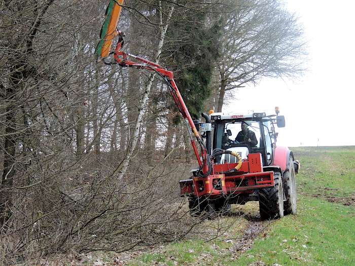 Außerdem sind wir mit der Pflege von Wald- und Wegrändern beschäftigt. Dafür ist ein Traktor mit einer Lichtraumprofilsäge an einem Ausleger ausgestattet, welcher die Äste und Hecken zurück schneidet. Ein weiterer räumt das Astmaterial weg und mulcht mit einem Auslegemulcher das Gestrüpp.