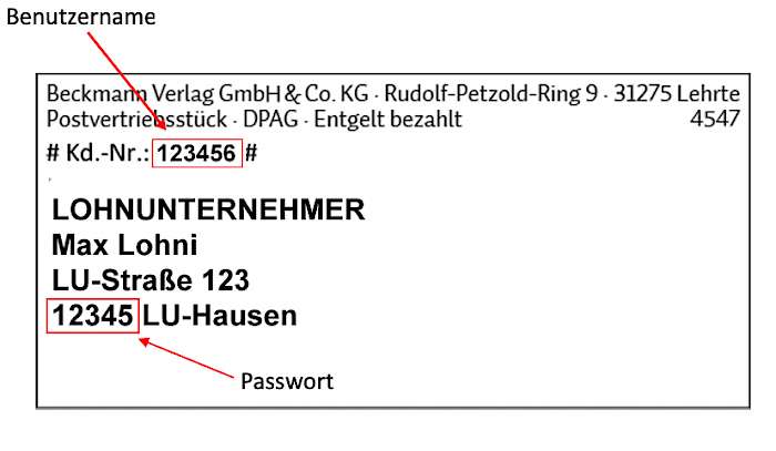 Zur Anmeldung benötigen Sie lediglich Ihre Kundennummer, die gleichzeitig Ihr Benutzername ist. Diese wird auf dem Adressblatt jeder LOHNUNTERNEHMEN-Ausgabe abgedruckt, das oben auf der Ausgabe aufliegt - siehe rechts.