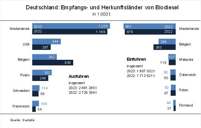 Die Niederlande bleiben mit Rotterdam als wichtigste Drehscheibe für den internationalen Biokraftstoffhandel der mit Abstand wichtigste Handelspartner für Biodiesel. 2023 stieg der Export im Vergleich zum Vorjahr um 3,6 % auf ca. 1,2 Mio. t. Auch der Handel in die USA und nach Polen hat zugenommen. Der Export in die Vereinigten Staaten verzeichnete mit 444.100 t einen Anstieg um 55 %, Sie sind damit der zweitwichtigste Abnehmer. Demgegenüber gingen die Lieferungen nach Belgien mit 381.800 t um rund 40 % zurück. Insgesamt erreichten die deutschen Biodieselexporte mit 2,9 Mio. t ein neues Rekordniveau bei einer Produktionsmenge von ca. 3,9 Mio. t.