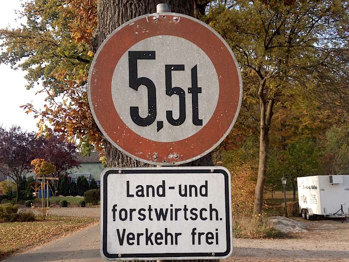 Das Zeichen 250 bedeutet: Verbot für Fahrzeuge aller Art. Wird das Zeichen 250 in Verbindung mit dem Zusatzzeichen 1026-38 angeordnet, bedeutet dies: Verbot für Fahrzeuge aller Art mit Ausnahme von land- und forstwirtschaftlichen Verkehr. Was ist nun land- und forstwirtschaftlicher Verkehr? Letztlich sind dies alle Fahrten die in einem Zusammenhang mit der land- und forstwirtschaftlichen Urproduktion (Bodenbewirtschaftung, Viehhaltung) stehen. Damit wird auch deutlich, dass nicht nur die Land- und Forstwirte diese Straßen befahren dürfen, an denen ihre Felder und Wälder liegen, sondern alle die im Rahmen des land- oder forstwirtschaftlichen Zwecks tätig sind.