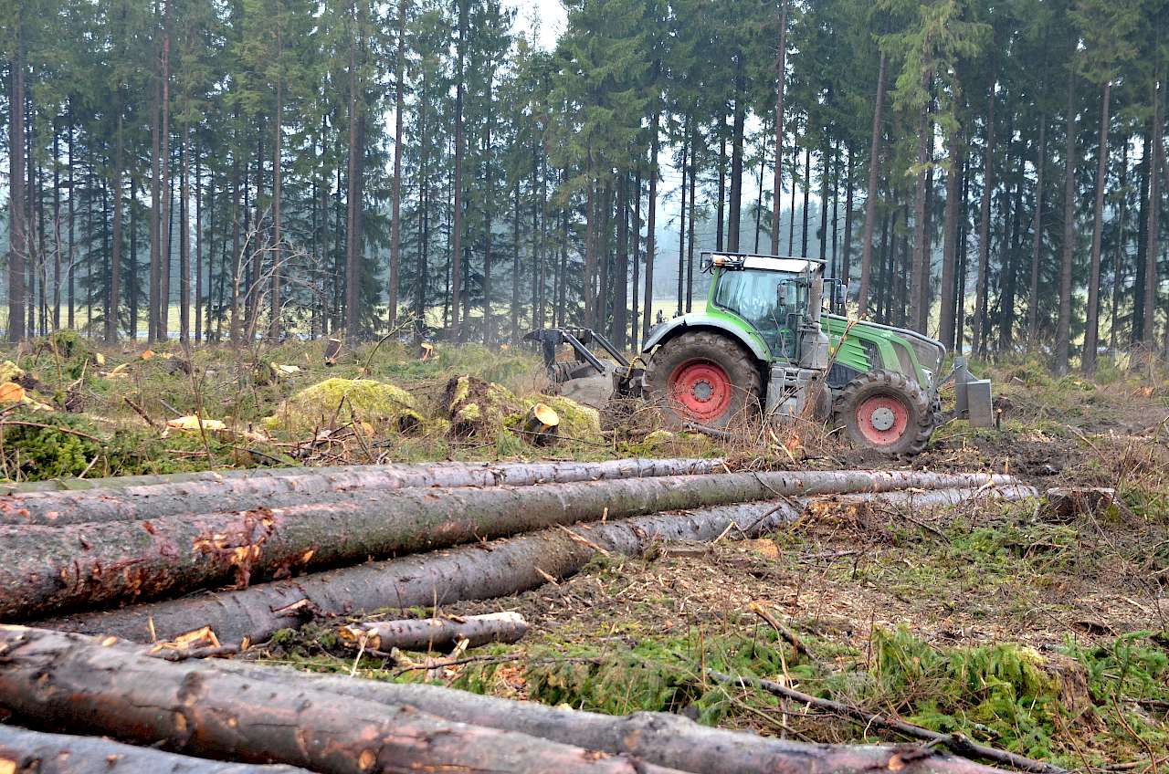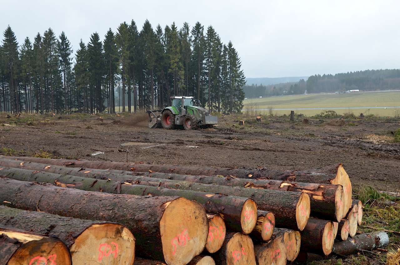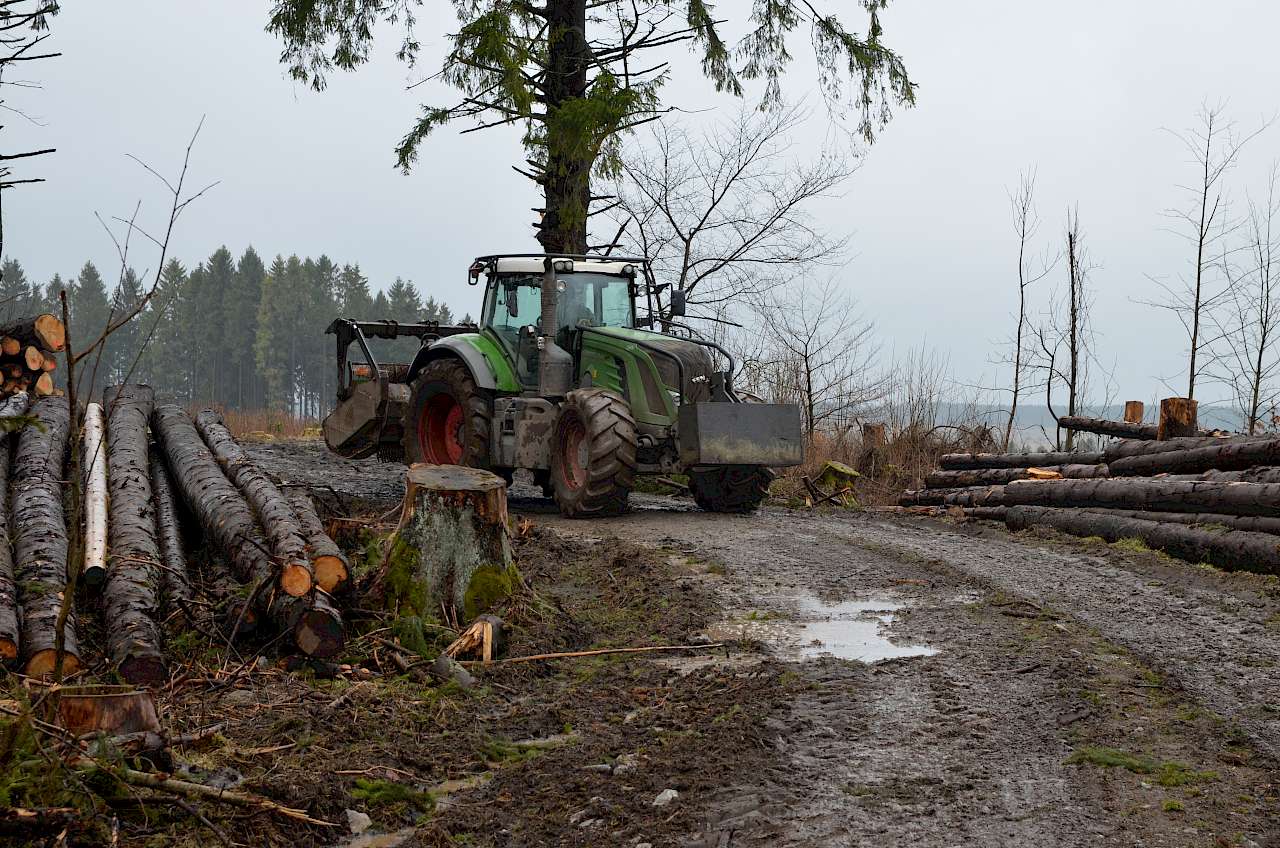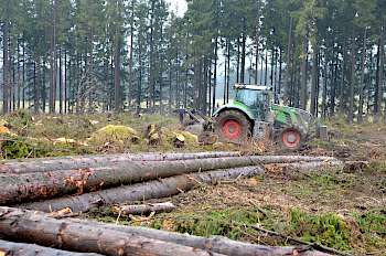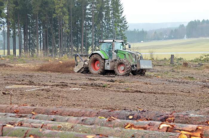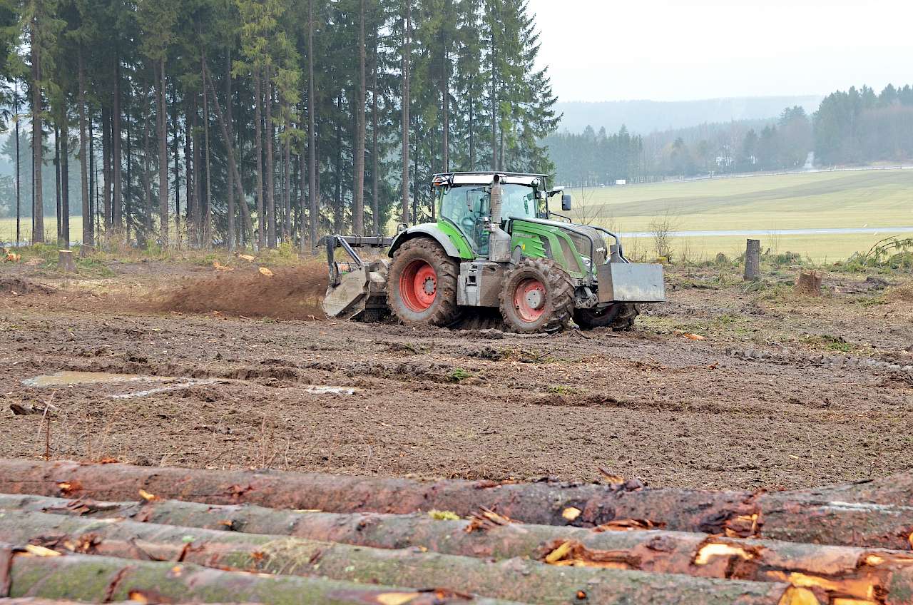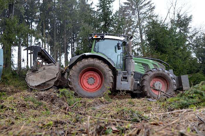 Mit seinem Forstmulcher der Firma FAE und einem Fendt 936 bearbeitet Till Krauhausen die Windwurffläche. Er unterbricht seine Arbeit, fährt den Schlepper von der Fläche und stellt ihn auf einem Waldweg ab. „Hier soll zukünftig naturnah aufgeforstet werden“, erklärt der 25-Jährige Mitarbeiter des Unternehmens. Manuell sollen neue Nadelbäume - Fichte, Douglasie und Lärche - gesetzt werden. Dafür ist es wichtig, dass die Fläche möglichst eben ist, allerdings sollen die Baumstümpfe weitestgehend erhalten bleiben, als kleine Habitate. „Wir wäre natürlich deutlich schneller, effektiver und es entsteht ein saubereres Endergebnis, wenn die Stubben auch gemulcht würden.“ Ein Sicherheitsabstand von 100 m sei obligatorisch, auch wenn sich gerade Frostmitarbeiter nicht immer daranhalten würden und sich der Maschine trotzdem nähern.