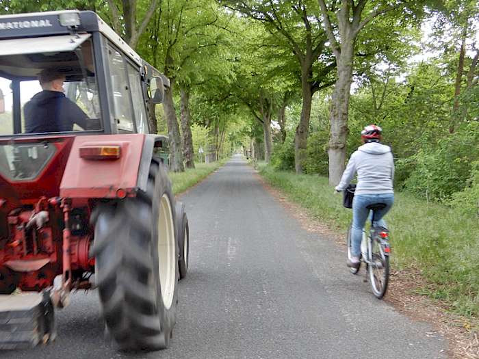 Ausgerüstet mit Breitreifen oder mit Arbeitsgeräten ist der Schlepper schon von sich aus bis zu drei Meter breit. Um die geforderten zwei Meter Abstand außerorts einhalten zu können, müsste der Traktor weit neben den Weg fahren und die Fußgänger und Radfahrer müssten weit zur Seite treten. Das ist nicht überall umsetzbar und da gilt es Ruhe zu bewahren. Für alle Beteiligten ist an dieser Stelle die Grundregel der StVO einzuhalten: In § 1 heißt es, dass von allen die am Straßenverkehr teilnehmen, die gegenseitige Rücksichtnahme verlangt wird. Jeder hat sich so zu verhalten, dass kein anderer geschädigt, gefährdet oder mehr als nach den Umständen vermeidbar behindert oder belästigt wird. Demnach ist also auch der Radfahrer in der Pflicht, an geeigneter Stelle auszuweichen und dem Traktor eine entsprechende Möglichkeit zum Überholen einzuräumen. Bis dahin muss sich der Traktorfahrer aber gedulden und im gebührenden Abstand hinterherfahren.