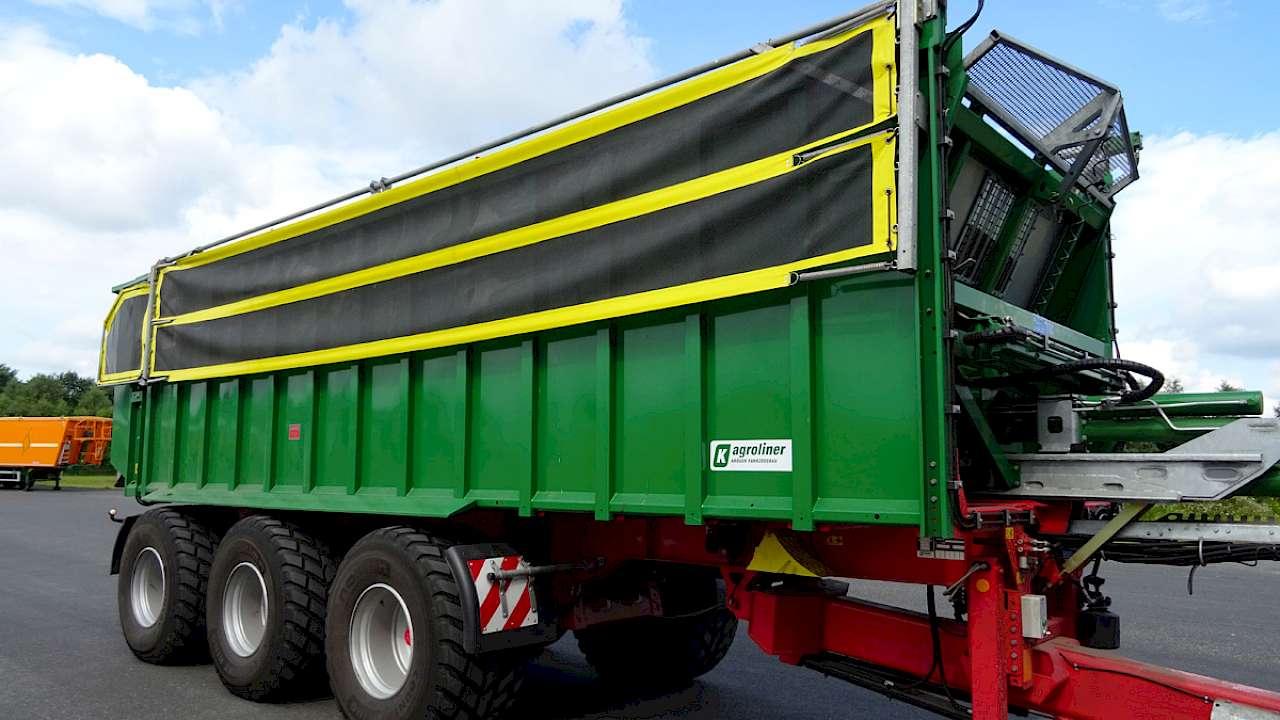 Wie sieht es in der Praxis aus? In der stressigen Maisernte fällt es schwer langsam zu fahren und die Anhänger nicht so voll zu beladen. Vor dem Hintergrund ist die Laderaumabdeckung eine echt sinnvolle Ausstattung, die aber bei übervoll beladenen Fahrzeugen und hoher Geschwindigkeit auch an ihre Grenzen kommt. Bei Anwohnern und der Polizei wird die Laderaumabdeckung gern gesehen. Sie ist ein positiver Beitrag zur Darstellung des Lohnunternehmers in der Öffentlichkeit!