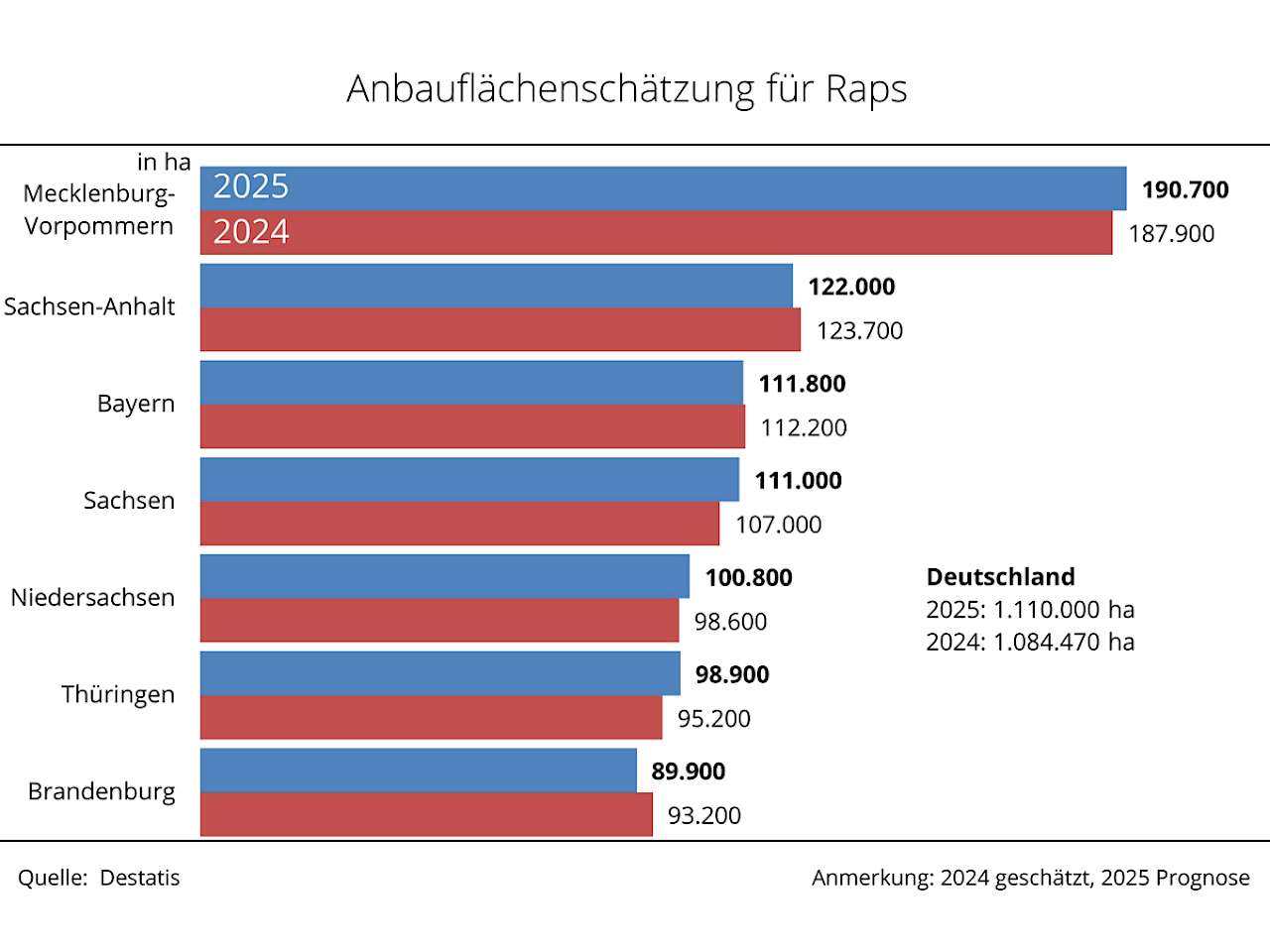 Die UFOP interpretiert das Ergebnis der eigenen Schätzung wie auch die Prognose des Statistischen Bundesamtes als erste Orientierung für die Erntefläche in 2025 sowie für eine erste Ertragsschätzung. Die vom Bundesamt veröffentlichte Schätzung der Aussaatfläche würde einem Plus von 2,3 % gegenüber dem Vorjahr entsprechen und wäre damit die zweitgrößte Winterrapsfläche seit 2018. Ausgehend von der Aussaatfläche und Durchschnittserträgen der letzten fünf Jahre wäre nach Schätzung der Agrarmarkt Informations-Gesellschaft mbH (AMI) eine Rapsernte von gut 4 Mio. t zu erwarten. Die Förderunion betont, dass die Aussaatfläche naturgemäß nicht gleich Erntefläche ist. Bemerkenswert ist die Bedeutung des Rapsanbaus in Ostdeutschland. Gut 55 % der deutschen Rapsfläche liegen in Brandenburg, Mecklenburg-Vorpommern, Sachsen-Anhalt, Sachsen und Thüringen.
