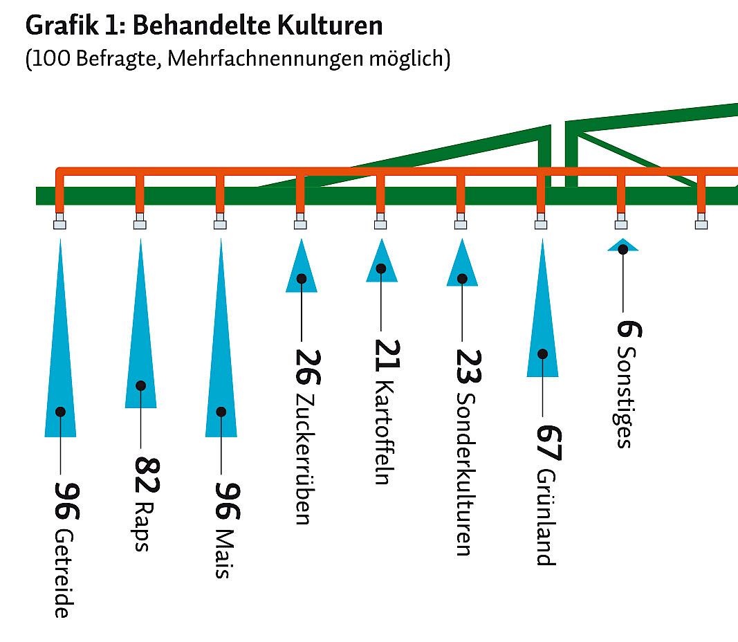 Grafik 1 zeigt das Spektrum der behandelten Kulturen. Eindeutig vorn stehen Getreide, Raps und Mais – aber dicht gefolgt von Grünland, was etwas überrascht. Verglichen mit Januar 2013, hat Getreide in der aktuellen Umfrage leicht zugenommen, Zuckerrüben und Grünland liegen etwas niedriger, aber die Sonderkulturen dafür erkennbar höher. Letzteres dürfte aber kein genereller Trend sein, sondern eher auf die regionale Verteilung der Befragten zurückzuführen sein.