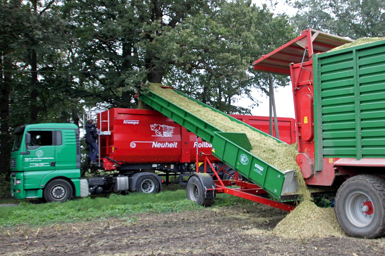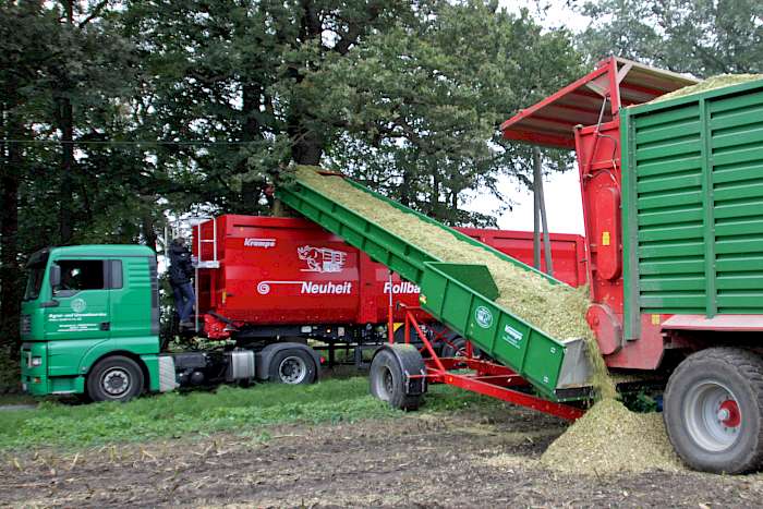 Der Hintergrund damals war nicht nur der kostengünstigere Lkw-Transport auf der Straße, sondern vor allem der Wunsch, auch nach hohen Niederschlägen ernten zu können, indem kleinere Häckselwagen zum Einsatz kommen, die in den Bunker des Überladebandes entleert werden. „Technisch hat das auch problemlos funktioniert, aber unter normalen Erntebedingungen mit größeren Häckselwagen macht diese Logistiklösung bei unseren kurzen Transportstrecken in der Maisernte keinen Sinn“, so das Fazit von Klaus Schmiemann.