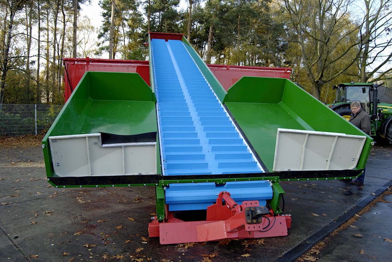 „Wichtig war uns eine möglichst große Reichweite, um bei Bedarf auch über Gräben hinweg den Lkw vom Feld aus beladen zu können. Und das Gerät sollte möglichst leicht und trotzdem robust gebaut sein. Diesen Anforderungen konnten wir dadurch gerecht werden, dass wir es in einem Trägerstück gebaut und für das Förderband Kunststoff statt Gummi verwendet haben. Das Förderband wird aus mehreren Teilen zusammengesteckt. Der Vorteil des Stecksystems besteht darin, dass sich das Förderband einfach verlängern lässt und man bei Bedarf die Schaufelgröße variieren kann. Die Kugelkopfanhängung ist teleskopierbar und lässt sich auf dem Boden ablegen, so dass wir es nicht abbauen müssen, wenn wir mit den Häckselwagen vor den Bunker fahren“, erklärt Schmiemann die Technik und betont, worauf es beim Einsatz des mobilen Förderbandes ankommt: „Wichtig ist ein zentral gelegener Standort mit ausreichend Platz zum Rangieren der Häckselwagen und Lkw. Ebenso wichtig ist ein fester Untergrund, damit wir mit unseren Häckselwagen auch die Befüllhöhe des Bunkers von 1 m erreichen.“ In den Einsatzversuchen im Mais erreichte das Überladeband laut Schmiemann eine maximale Leistung von 40 m³ in 1,5 Minuten. Einen weiteren Einsatzbereich für das Überladeband kann er sich beim Umsilieren von Haufensilagen vom Feld auf den Hof vorstellen.