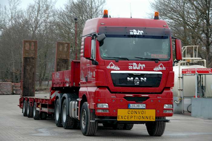 Zu den jüngsten Anschaffungen gehört übrigens ein Spezial-Tieflader mit Dolly-Achse, der demnächst geliefert werden soll. Mit seiner Hilfe wird es möglich sein, auch XXL-Baumaschinen und andere Großbauteile zu transportieren (Zuladung 46 Tonnen). Denn derartige Logistik zählt ebenfalls zum Leistungsspektrum des Firreler Unternehmens, dieses dann aber durchaus überregional. Zu den regelmäßigen Kunden gehört übrigens die Firma Zeppelin, wie der kaufmännische Leiter berichtet. In deren Niederlassung Achim bei Bremen werden unter anderem die in Übersee produzierten Caterpillar-Dumper für den hiesigen Einsatz vorbereitet und zu den Kunden transportiert – letzteres ein typischer Job für de Buhr.
